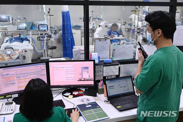 [안성=뉴시스] 김종택기자 = 전 세계적으로 신종 코로나바이러스 감염증(코로나19) 확진 판정을 받은 누적 인구가 1억명을 넘어선 26일 경기도의료원 안성병원 코로나19 음압격리병동 중환자실에서 의료진들이 환자를 치료하고 있다. 누적 확진자 1억명 돌파는 지난 10일 9천만명을 넘긴 지 16일만이다. 세계 코로나19 확진자는 지난해 11월 9일 5천만명을 넘긴 뒤 15일 안팎의 간격을 두고 1천만명씩 증가해 왔다. 2021.01.26.