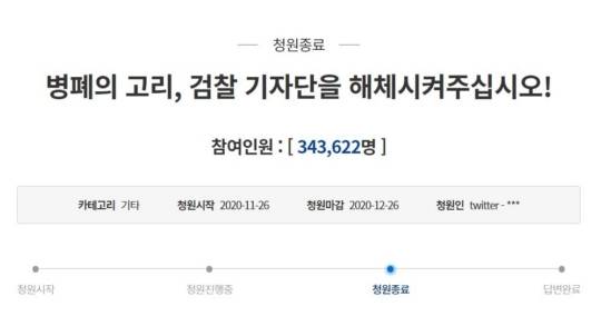 청원인은 검찰기자단을 '병폐의 고리'로 지적하고 "폐쇄성이 짙어지며 패거리 문화가 싹트고, 검찰이 흘려준 말 한마디가 온 신문과 뉴스에 도배돼 순식간에 거짓도 사실이 되어 버린다"며 기자단 해체를 요구했다. 청원에는 34만3,622명의 국민들이 동의했다.