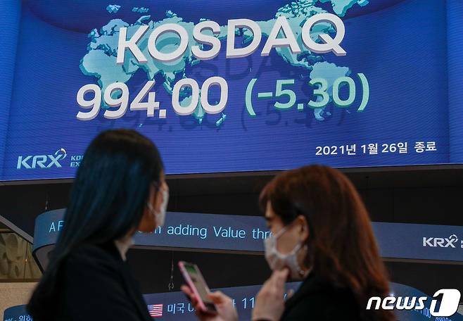 (서울=뉴스1) 안은나 기자 = 26일 오후 서울 여의도 한국거래소 전광판에 코스닥 지수가 전 거래일보다 5.30포인트(0.53%) 하락한 994.00을 나타내고 있다. 2021.1.26/뉴스1