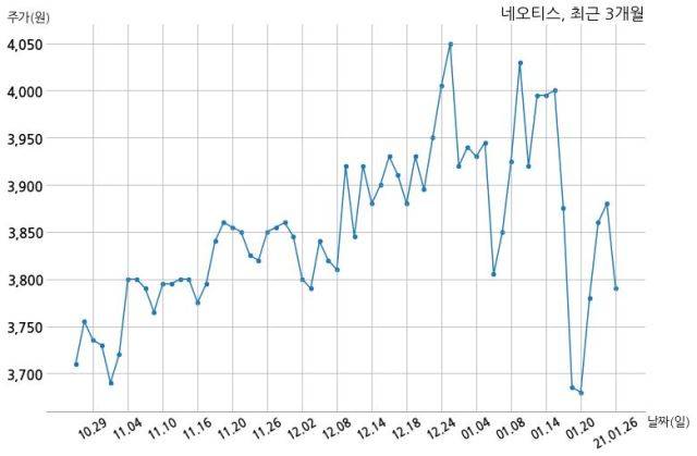 한편, 네오티스는 장 마감 이후 해당 기업공시를 발표했으며 오늘 종가가 3,790원, 거래량은 63,259주로, 직전 거래일 대비 90원(-2.32%) 하락했다.