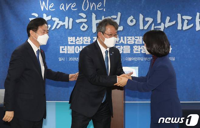 (부산=뉴스1) 여주연 기자 = 변성완 전 부산시장 권한대행이 26일 오후 부산 연제구 더불어민주당 부산시당에서 김영춘·박인영 부산시장 예비후보에게 입당 축하를 받고 있다. 2021.1.26/뉴스1