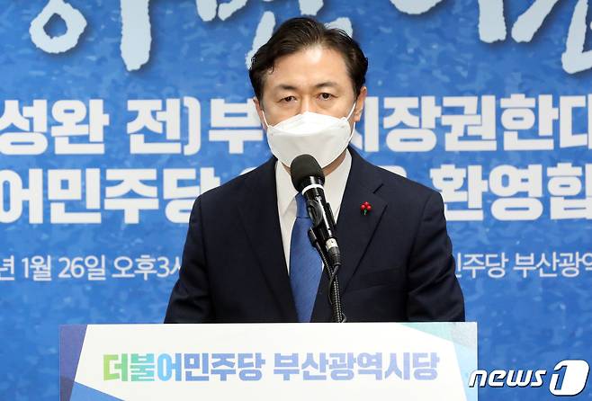 (부산=뉴스1) 여주연 기자 = 김영춘 부산시장 예비후보가 26일 오후 부산 연제구 더불어민주당 부산시당에서 열린 변성완 전 부산시장권한대행 더불어민주당 입당 환영식에서 환영사를 하고 있다. 2021.1.26/뉴스1