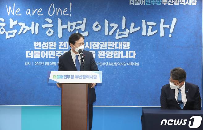 (부산=뉴스1) 여주연 기자 = 김영춘 부산시장 예비후보가 26일 오후 부산 연제구 더불어민주당 부산시당에서 열린 변성완 전 부산시장권한대행 더불어민주당 입당 환영식에서 환영사를 하고 있다. 2021.1.26/뉴스1