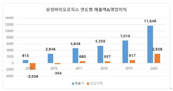 삼성바이오로직스는 26일 공시를 통해 2020년 연간 기준 매출은 1조 1648억원, 영업이익은 2928억원을 기록했다고 밝혔다. 매출은 전년 대비 66.0% 증가했고, 영업이익은 219.3% 불어났다.