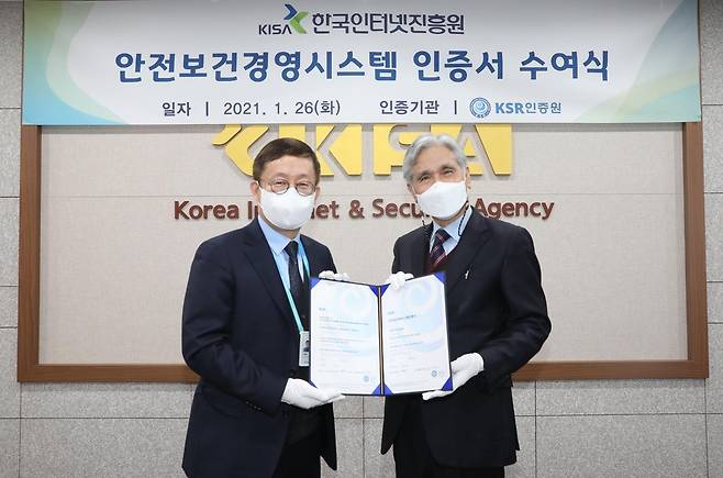 (서울=연합뉴스) KISA 이원태 원장(왼쪽)과 KSR인증원 김장섭 회장이 26일 KISA 나주본원에서 열린 '안전보건경영시스템 인증서 수여식'에서 기념사진을 촬영하고 있다. 2021.1.26