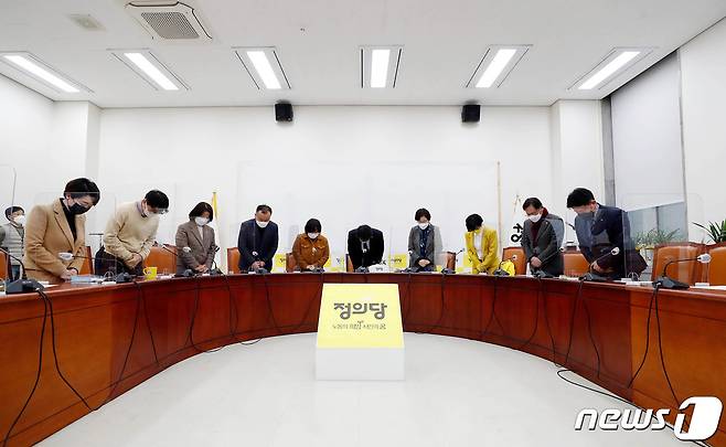 (서울=뉴스1) 성동훈 기자 = 김윤기 정의당 당대표 직무대행, 이은주, 배진교, 류호정 의원 등 참석자들이 26일 서울 여의도 국회에서 열린 전략협의회에서 김종철 전 대표 성추행 사건에 대해 사과하고 있다. 2021.01.26/뉴스1