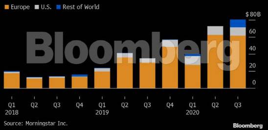 26일(현지시간) 블룸버그통신에 따르면 환경과 사회, 기업 지배구조에 앞장 서는 기업들에 투자하는 상장지수펀드(ETF)가 지난해 미국과 유럽에서만 850억달러(원화 약 94조1000억원)라는 사상 최대 자금 순유입을 기록했다. 미국에서 328억달러라는 역대 최대 순유입을 기록했고, 유럽에서도 430억유로(530억달러)가 순유입됐다. 이 같은 자금 순유입은 올 들어서도 이어지고 있다.