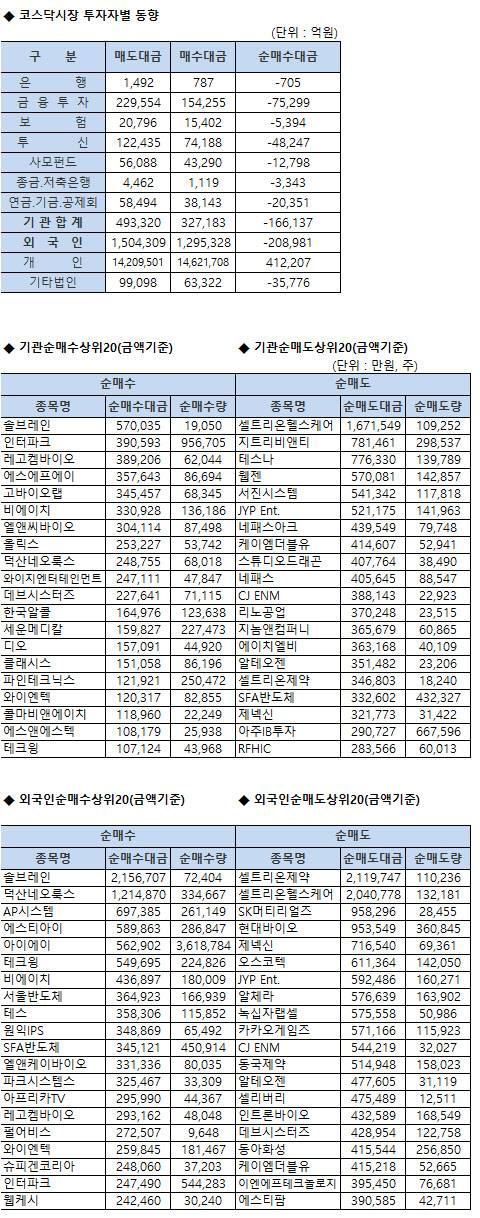 [표]코스닥 기관/외국인 매매동향(1/26 3시30분)