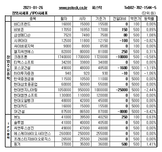 에스케이바이오사이언스(25만5000원), 프레스티지바이오로직스(2만6000원), 바디프랜드(1만5500원), 싸이버로지텍(8500원), 현대엠엔소프트(12만원), 한국코러스(2만원), 노바셀테크놀로지(7500원), 진켐(1만5000원) 등 장외종목은 주가변동없이 장을 마감했다.
