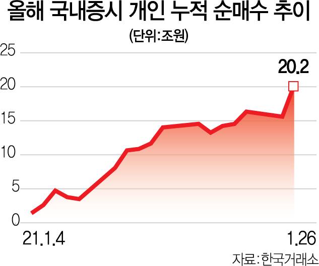 개인 투자자들의 증시 순매수 금액이 올 들어 17거래일 만에 20조 원을 돌파했다.