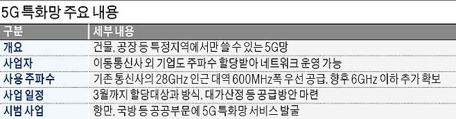 과기정통부는 5G 기술이 산업 전반으로 빠르게 확산할 수 있도록 5G 특화망을 도입하기로 했다. 5G 특화망은 특정 지역에 도입하려는 서비스에 특화된 맞춤형 네트워크다. 그동안 기업이 공장이나 건물에서 기업용 5G망을 이용하려면 통신 3사(SK텔레콤·KT·LG유플러스)의 5G망을 빌려야 했지만 앞으로는 기업이 직접 주파수를 할당받아 기지국을 구축해 산업 현장에 활용할 수 있다.