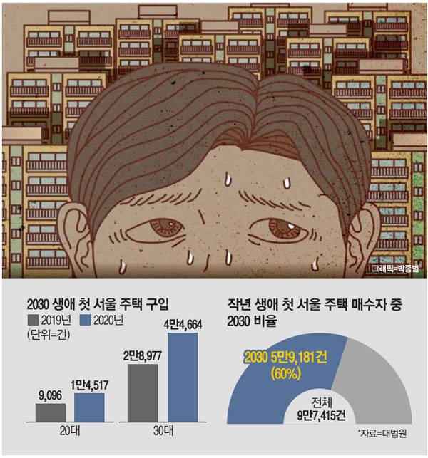 부동산 시장에서 2030 청년층 비중이 급속도로 높아지고 있다. 정부가 연달아 부동산 대책을 내놓았지만 오히려 집값이 폭등하자 급히 '첫 집'을 매수한 사례가 늘어난 것이다. 또 부동산이나 주식 가격이 폭등하면서 현금 가치에 대한 신뢰가 떨어진 점도 이들의 매수세를 부추기는 원인으로 꼽힌다.