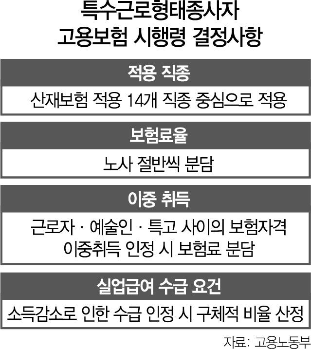 하지만 보험료율을 어떻게 분담할 것인지 등 구체적 기준은 시행령에서 정해야 한다. 또 특고는 일반 근로자와 달리 소득이 감소해도 실업급여를 지급하는 것을 원칙으로 정했는데 감소 비율 기준을 몇 %로 정할 것인지와 비교 시기는 언제로 정할 것인지 모두 노사 협의 대상이다.