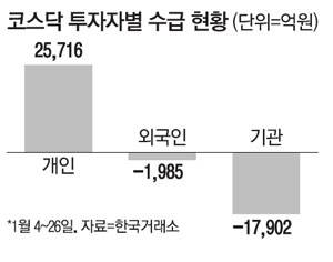 개인이 4114억원어치 순매수했지만 역부족이었다. 이날 코스피 또한 전일 대비 2.14% 떨어져 3140.31을 기록하며 장을 마쳤는데, 개인은 4조2050억원어치 순매수했다. 지난 11일 4조4921억원어치 순매수한 이래 가장 많이 사들인 것이다. 개인이 이날 하루에만 양대 증시에서 4조원 넘게 순매수했는데 지수는 모두 하락으로 마감했다. 유가증권 시장과 코스닥 시장을 합친 개인 순매수액은 4조6164억원으로, 사상 최대 기록(종전 1월 11일 4조5782억원)을 다시 썼다.
