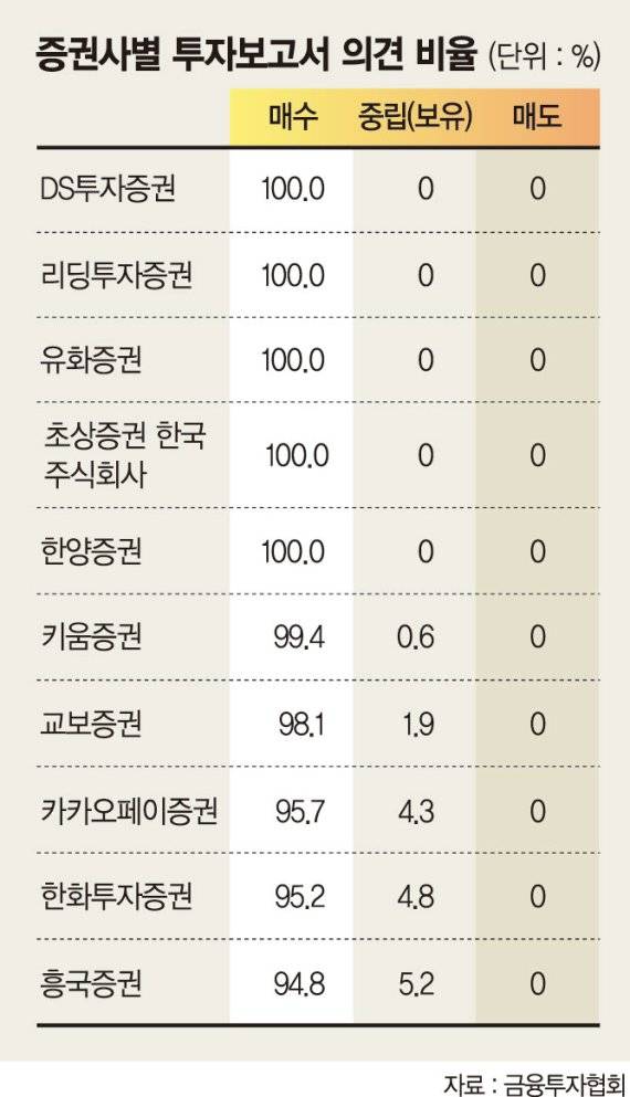 국내 31개 증권사(유안타증권 포함)의 매수의견 비율을 별도로 추산하면 90.4%로 훌쩍 뛴다.