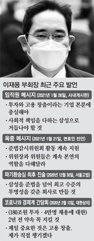 이 부회장은 이날 메시지에서 "사회적 책임을 다하는 삼성으로 거듭나야 한다"며 "이미 국민께 드린 약속들은 반드시 지켜야 한다"고 강조했다. 이 부회장이 언급한 '약속'은 지난해 5월 대국민 사과를 언급한 것으로, 이 부회장의 준법경영 의지를 다시 한번 드러내는 표현이라는 게 재계 해석이다. 삼성 준법감시위원회 권고를 받은 이 부회장은 사과문을 통해 자녀에 대한 경영권 승계 포기, 무노조 경영 철폐, 시민사회와 소통 확대 등을 발표한 바 있다. 당시 이 부회장은 "준법은 결코 타협할 수 없는 가치이며 준법이 삼성의 문화로 확고하게 뿌리내리도록 하겠다" "재판이 끝나더라도 준법위는 독립적인 위치에서 계속 활동할 것이고, 활동이 중단 없이 이뤄지도록 하겠다"고 밝히는 등 준법경영 의지를 강조해 왔다.