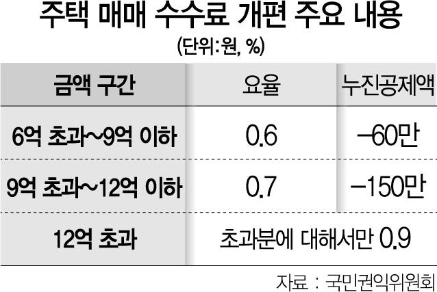 권익위 권고안은 기존 중개 수수료 부과 대상 구간에 9억 원 초과~12억 원 이하 구간을 새롭게 마련하고 0.7%의 수수료율을 적용하기로 했다. 기존에는 9억 원을 초과하면 최고 요율인 0.9%가 적용됐다. 권고안은 12억 원을 초과할 경우 초과액에 대해서만 0.9%를 적용하도록 했다. 전세 또한 6억~9억 원 구간을 신설하고 수수료율을 0.5%로 고정했다. 9억 원을 초과하는 경우 초과분에 대해서만 0.8%를 적용하는 방식이다.