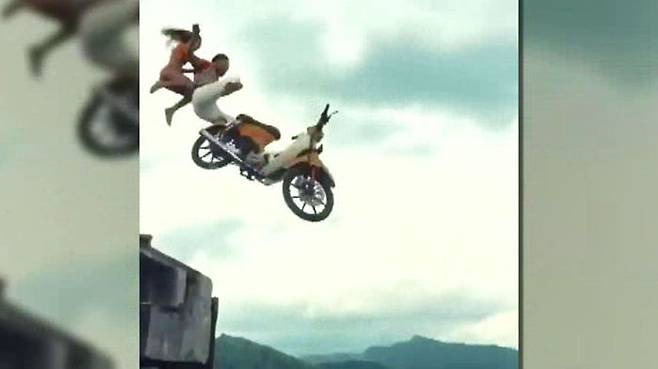 그대로 바다로 뛰어드는데요, 그런데 물에 빠진 두 사람은 대단한 일을 해냈다는 듯 웃어 보였고 오토바이는 물 아래로 가라앉았습니다.