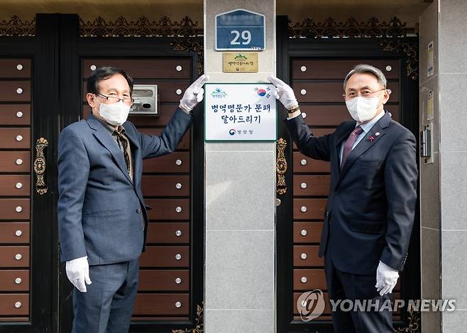 (서울=연합뉴스) 모종화 병무청장(오른쪽)이 26일 3대 가족 모두 현역복무를 마친 병역명문가 김용혁 씨의 광주광역시 북구 소재 집을 방문해 '병역명문가의 집' 문패를 달아준 후 기념 촬영을 하고 있다. 2021.1.26