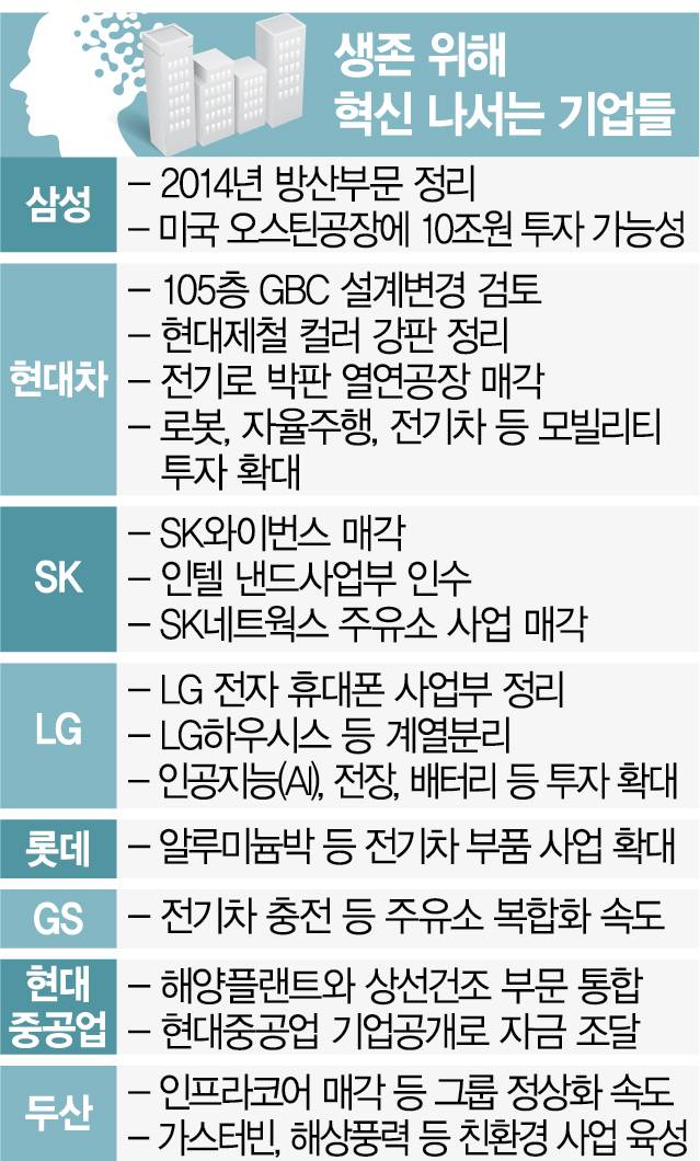 최태원 SK그룹 회장은 반도체와 전기차 배터리 등에 그룹의 역량을 집중하고 있다. SK하이닉스는 지난해 10월 미국의 종합 반도체 기업 인텔의 낸드플래시 사업부를 인수하는 계약을 체결했다. D램에 비해 상대적으로 취약한 낸드플래시의 경쟁력을 강화해 전반적인 글로벌 반도체 시장점유율을 확대하겠다는 포석이다. SK하이닉스가 인텔의 낸드 사업을 인수하면서 시장점유율은 기존의 9.9%에서 19.4%로 껑충 뛰었다. SK하이닉스는 “빅데이터 시대를 맞아 급성장하는 낸드 분야에서 기업용 솔리드스테이트드라이브(SSD) 등 경쟁력을 강화해 글로벌 선두권 기업이 되겠다”며 세계 최강자로 올라서겠다는 포부를 드러냈다. SK그룹이 최근 SK와이번스 매각을 전격 결정한 것도 신사업에 그룹의 역량을 쏟아붓겠다는 의지의 표현이라는 게 재계의 해석이다. 재계 관계자는 “SK그룹은 SK텔레콤을 제외하면 기업간거래(B2B) 사업이 대부분”이라며 “사업 구조상 프로야구단 운영에 큰 실익이 없다고 판단한 듯하다”고 했다. 최신원 회장이 경영을 맡고 있는 SK네트웍스도 주력이던 주유소 부문을 매각하고 렌털 중심으로 기업 구조를 개편했다.