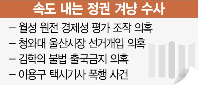 ‘추·윤 갈등’ 국면에서 한동안 멈춰섰던 정권 관련 수사가 동시다발적으로 속도를 내고 있다. 고위공직자범죄수사처 수사팀이 꾸려지기 전에 주요 수사를 마무리 짓거나 최대한 진척시키기 위함이라는 분석이 나온다.