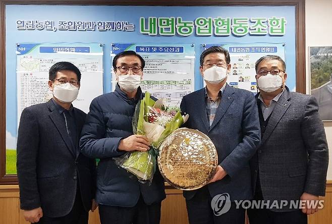 (춘천=연합뉴스) 26일 강원 홍천 내면농협을 방문한 장덕수 농협 강원지역본부장(왼쪽 세번째)이 지난해 연합사업 매출 200억원 달성을 기념하는 우수사무소 표창패를 전달하고 있다.