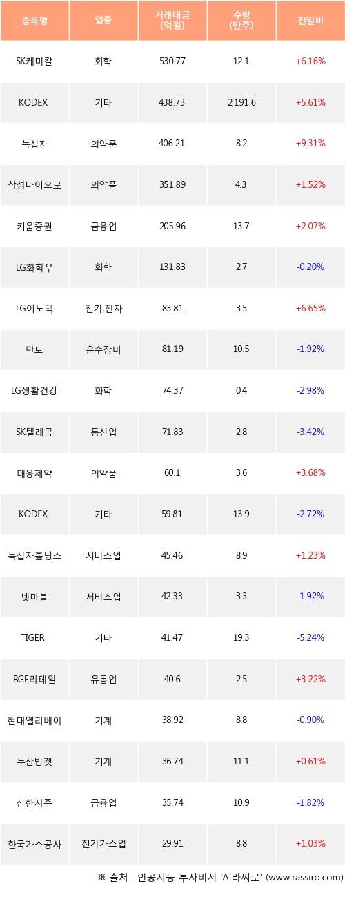 SK케미칼, KODEX 200선물인버스2X, 녹십자 등은 전일 대비 주가가 상승했고, LG화학우, 만도, LG생활건강 등은 주가가 하락했다.