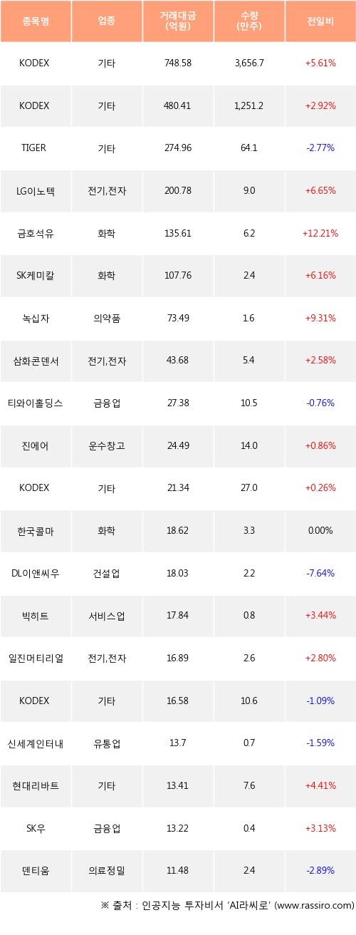KODEX 200선물인버스2X, KODEX 인버스, LG이노텍 등은 전일 대비 주가가 상승했고, TIGER 200, 티와이홀딩스, DL이앤씨우 등은 주가가 하락했다.