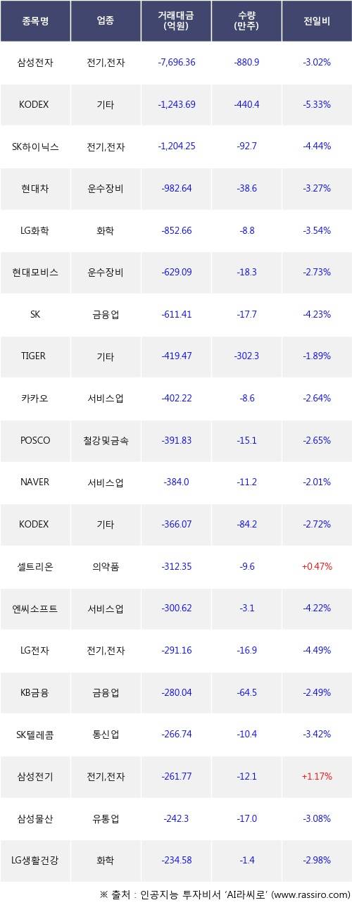 26일, 기관 거래소에서 삼성전자(-3.02%), KODEX 레버리지(-5.33%) 등 순매도