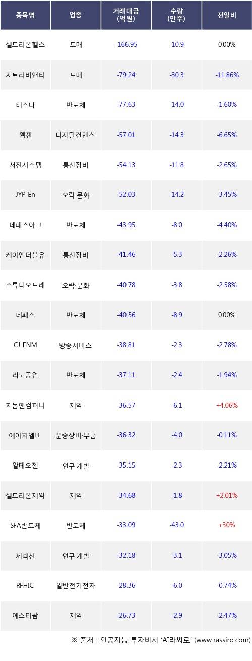 기관 투자자의 순매도 상위 20개 종목은 셀트리온헬스케어, 지트리비앤티, 테스나, 웹젠, 서진시스템, JYP Ent., 네패스아크, 케이엠더블유, 스튜디오드래곤, 네패스등이다.