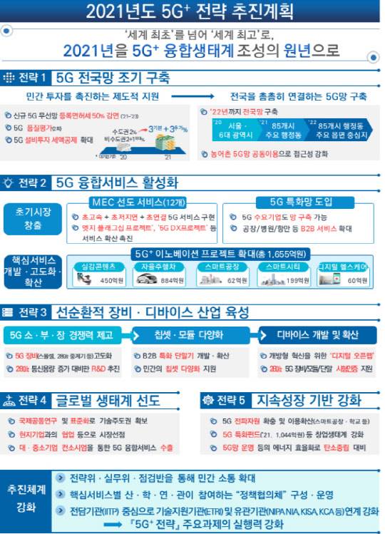 범부처 차원에서 추진되는 5G+ 추진방향은 전국망의 조기 구축과 함께, 5G 융합서비스 활성화를 위한 선도서비스 개발을 촉진하는 것이다.