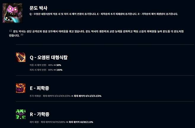 문도는 스킬 전반적인 버프를 받았다. 먼저 Q스킬 오염된 대형식칼의 적중 시 체력 반환이 50%, 처치 시 체력 반환이 100%로 증가했고 궁극기 가학증의 체력 재생이 최대 체력의 60/85/110%로 증가해 푀복 능력과 생존력을 강화했다. 또한 E스킬 피학증의 추가 피해량이 최대 체력의 4/4.5/5/5.5/6%로 증가해 교전 능력을 강화했다.