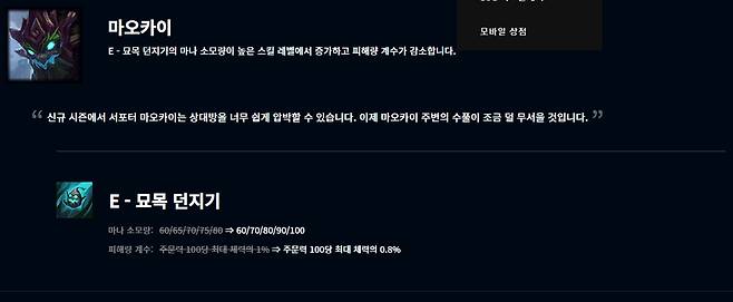 챔피언 밸런스 조정도 이어졌다. 프로 대회와 랭크 게임에서 위력을 뽐내는 챔피언들에 대한 하향이 진행됐다. 서포터 자리에서 맹활약 중인 마오카이는 E스킬 묘목 던지기의 마나 소모량이 60/70/80/90/100으로 늘었고 피해량 계수도 주문력 100당 최대 체력의 0.8%로 낮아졌다.