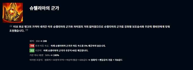 상향을 받은 신화급 아이템은 슈렐리아의 군가다. 슈렐리아의 군가는 조합식이 점화석+밴들유리 거울+750골드로 바뀌어 체력이 200으로 감소하고 이동속도 효과가 사라진 대신 주문력 40을 제공하고 기본 마나 재생이 100%로 늘어 강화형 보조술사와 주문력 챔피언에게 맞게 조정했다.