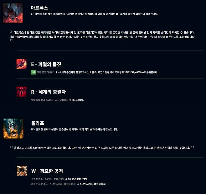 올라프는 W스킬 광포한 공격의 생명력 흡수가 16/18/20/22/24%로 증가한 대신 체력 회복 효과 증가량이 잃은 체력에 비례해 0~33%로 하향됐다.