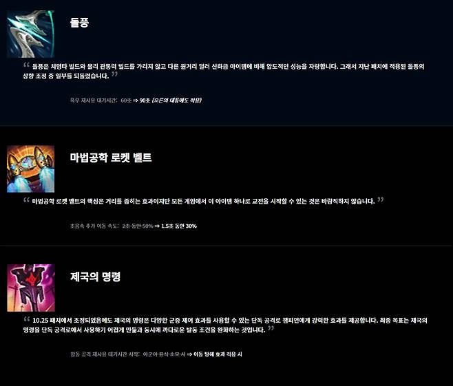 이번 패치에서도 다시 한 번 대대적인 아이템 조정이 진행됐다. 전설급 아이템 중에서는 돌풍의 변화가 눈에 띈다. 지난 11.1 패치로 폭우의 재사용 대기시간이 60초로 감소하며 많은 원거리 딜러들의 각광을 받았던 돌풍은 이번 패치에서 재사용 대기시간이 다시 90초로 돌아왔다.