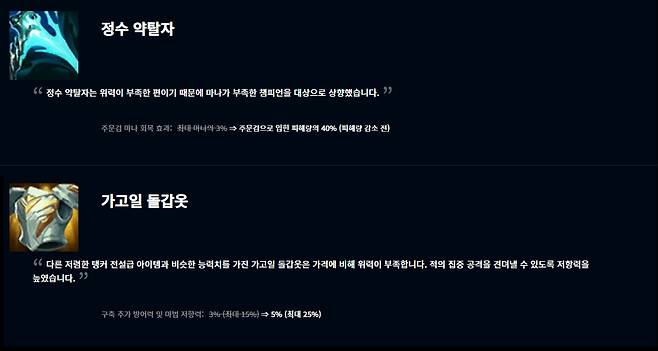 전설급 아이템에서는 정수 약탈자와 가고일 돌갑옷이 상향됐다. 정수 약탈자는 주문검 마나 회복 효과가 주문검으로 입힌 피해량의 40%로 조정됐고 가고일 돌갑옷은 구속 추가 방어력 및 마법 저항력이 5%(초대 25%)로 크게 늘었다.