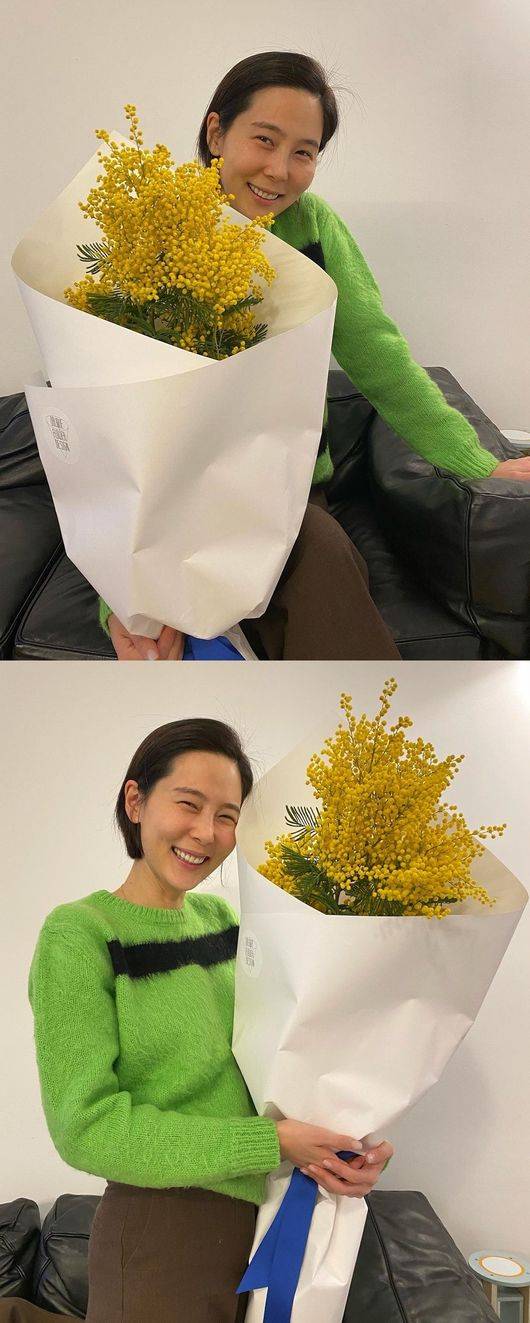 공개한 사진 속 김나영은 포근한 초록색 니트에 커다란 꽃다발을 든 채 사랑스러운 미소를 짓고 있다.