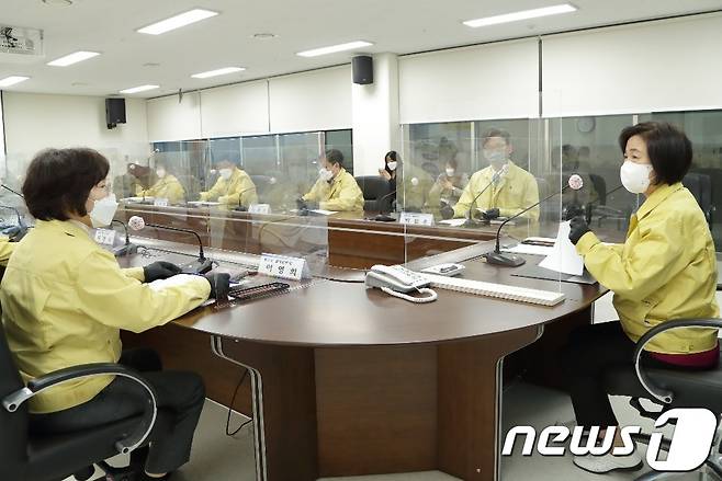 (서울=뉴스1) = 추미애 법무부 장관이 26일 서울동부구치소를 찾아 이영희 교정본부장으로부터 코로나19 대응실태 및 후속조치 계획을 보고받고 있다. (법무부 제공) 2021.1.26/뉴스1