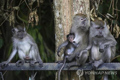 epa08966175 A long-tailed macaque breast feeds her baby at Jugra hills, outside Kuala Lumpur, Malaysia, 26 January 2021. Celebrity primatologists and scientists have been urged not to post selfies with chimpanzees, orangutans and other primates on social media to help conservation efforts for threatened species. EPA/FAZRY ISMAIL