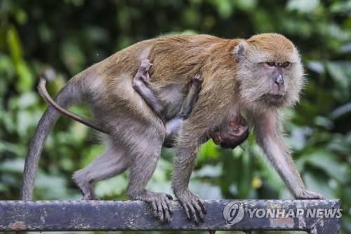 epa08966182 A long-tailed macaque breast feeds her baby at Jugra hills, outside Kuala Lumpur, Malaysia, 26 January 2021. Celebrity primatologists and scientists have been urged not to post selfies with chimpanzees, orangutans and other primates on social media to help conservation efforts for threatened species. EPA/FAZRY ISMAIL
