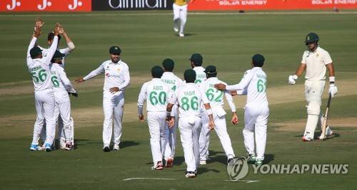 epa08966221 South African batsman Aiden Markram (R) leaves the ground after he was bowled by Pakistan's Shaheen Shah during the first day of first cricket test match between Pakistan and South Africa in Karachi, Pakistan, 26 January 2021. The South African cricket squad arrived in Pakistan for their first tour consisting of two Test and three T20 matches after a 14-year break. EPA/SHAHZAIB AKBER
