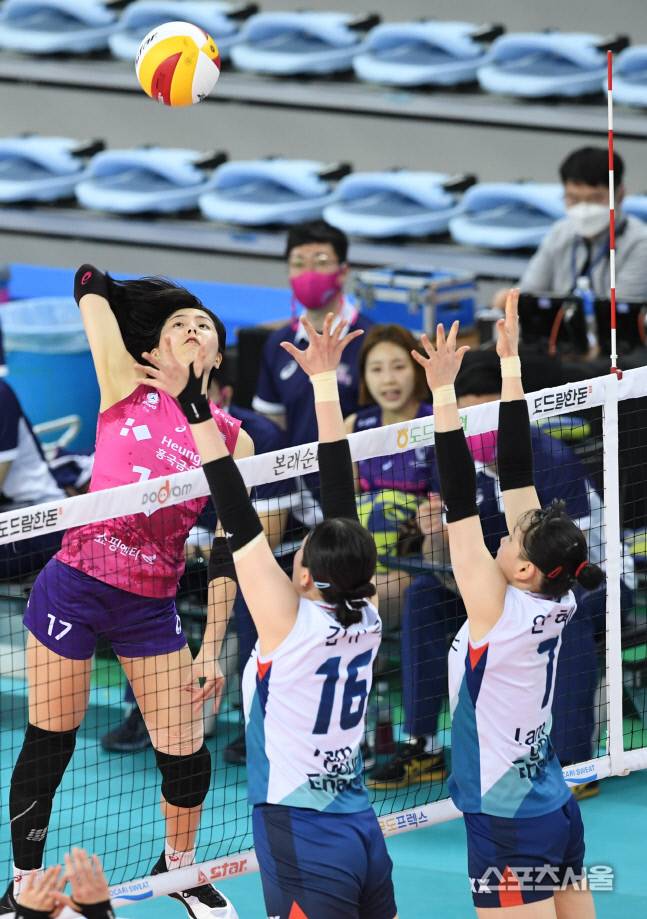 흥국생명의 이재영이 26일 인천 계양체육관에서 진행된 GS칼텍스와의 경기에서 강타로 공격하고있다. 2021.01.26. 김도훈기자 dica@sportsseoul.com