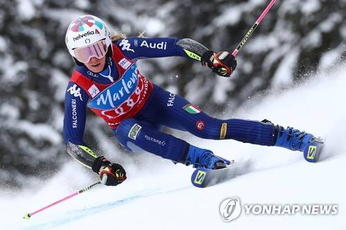 epa08966244 Marta Bassino of Italy in action during the Women's Giant Slalom race at the FIS Alpine Skiing World Cup in Kronplatz, Italy, 26 January 2021. EPA/ANDREA SOLERO