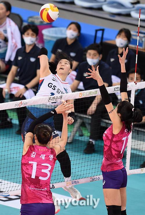 [마이데일리 = 인천 유진형 기자] GS칼텍스 유서연이 26일 오후 인천계양체육관에서 진행된 '2020-2021 V리그' 여자부, 흥국생명과 GS칼텍스의 경기에서 스파이크를 강타하고 있다.