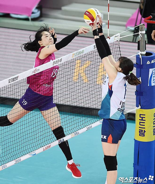 [엑스포츠뉴스 인천, 박지영 기자] 26일 오후 인천 계양체육관에서 열린 '도드람 2020-2021 V리그' 여자부 흥국생명과 GS칼텍스의 경기, 흥국생명 김미연이 공격을 시도하고 있다.