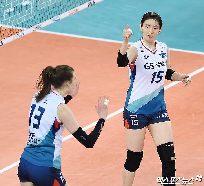 [엑스포츠뉴스 인천, 박지영 기자] 26일 오후 인천 계양체육관에서 열린 '도드람 2020-2021 V리그' 여자부 흥국생명과 GS칼텍스의 경기, GS칼텍스 문명화가 러츠를 향해 엄지를 들어보이고 있다.