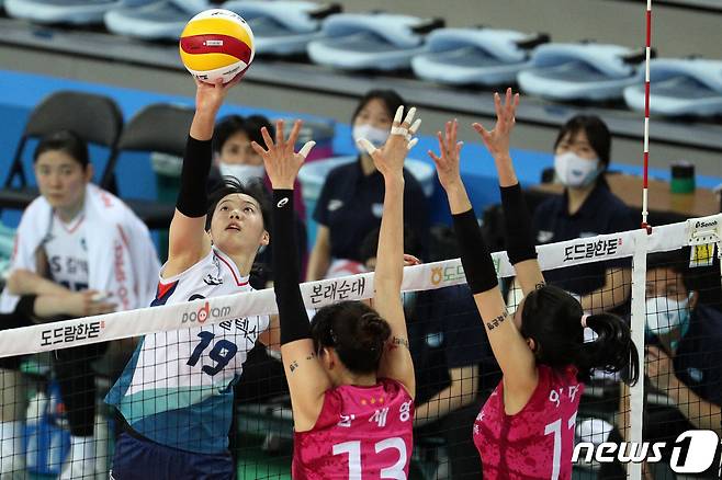 (인천=뉴스1) 황기선 기자 = 26일 오후 인천 계양체육관에서 열린 프로배구 '2020-21시즌 도드람 V리그' 여자부 흥국생명과 GS칼텍스의 경기에서 GS칼텍스 유서연이 공격을 시도하고 있다. 2021.1.26/뉴스1