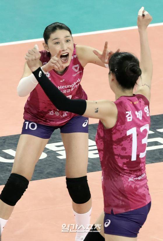 2020~2021 프로배구 V리그 여자부 흥국생명과 GS칼텍스의 경기가 26일 오후 인천 계양체육관에서 열렸다. 김연경이 서브득점을 올린 김세영을 보며 환호하고 있다.