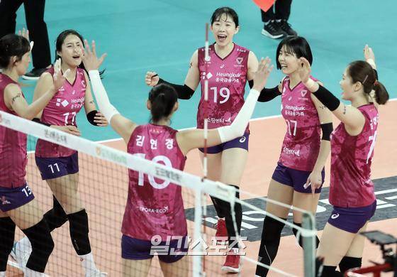 2020~2021 프로배구 V리그 여자부 흥국생명과 GS칼텍스의 경기가 26일 오후 인천 계양체육관에서 열렸다. 흥국생명 선수들이 3세트를 따내고 기뻐하고 있다.